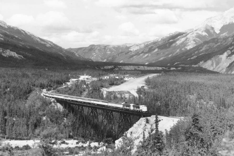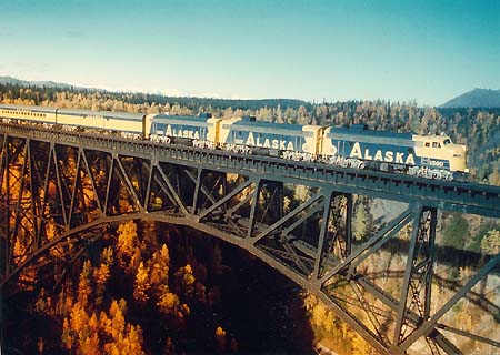 A classic Alaska Railroad passenger train with two F type diesels on the Riley Creek Bridge, in the background the Alaska Range (Alaska Railroad)