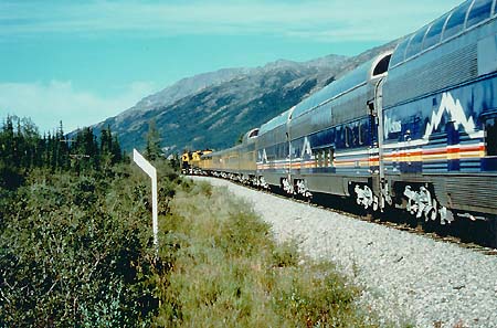 The standard-gauge Alaska Railroad Seward - Anchorage - Fairbanks was completed in 1923. During season there are running yellow/dark-blue tourist trains. Then stainless second-hand full-length dome cars were introduced, running for Westours, from 1971 a subsidiary of Holland America Line, conveying cruise passengers. Under the label Wilderness Express, rebuilt bi-level cars were added for Royal Caribbean International cruise passengers. The nice GM/EMD F diesels however have gone.