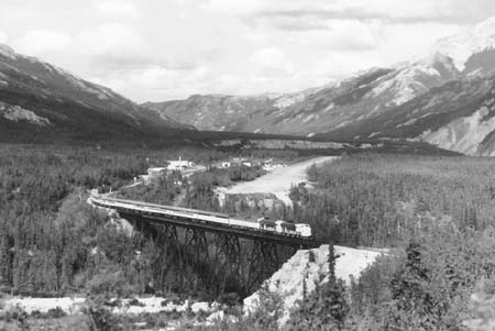 Alaska Railroad Express with F7 and two B diesel units on Hurricane Gulch Bridge, mile post 284.2, the Alaska Range in the background (Alaska Railroad)