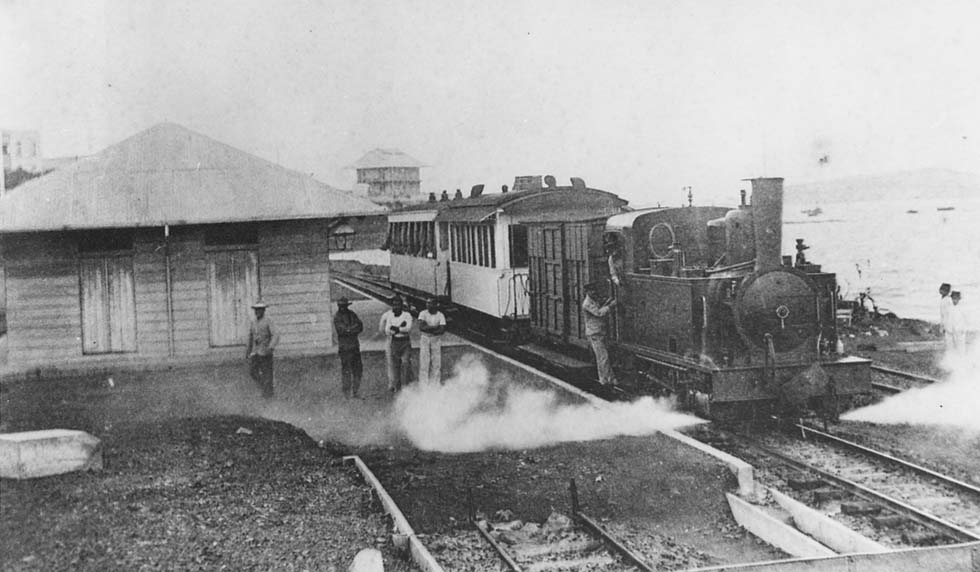 Passenger train of Nouvelle Caledonie with a Corpet & Louvet engine from 1903 or 1905, departure at Noumea for La Dumbia c.1930 (coll. Charles S.Small)