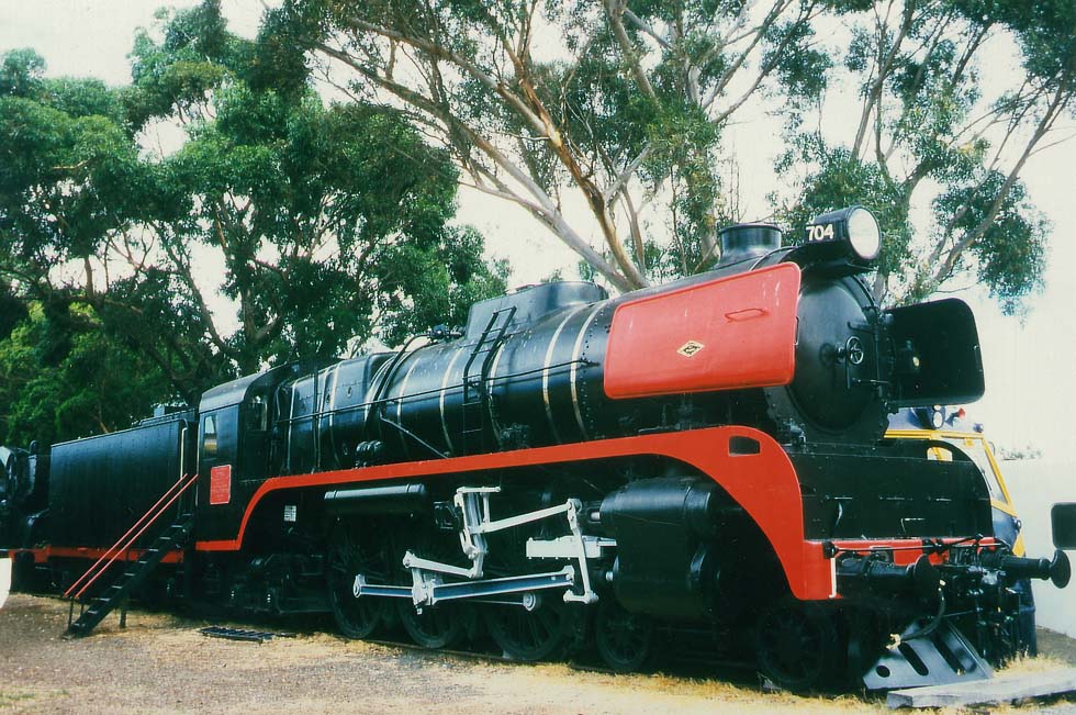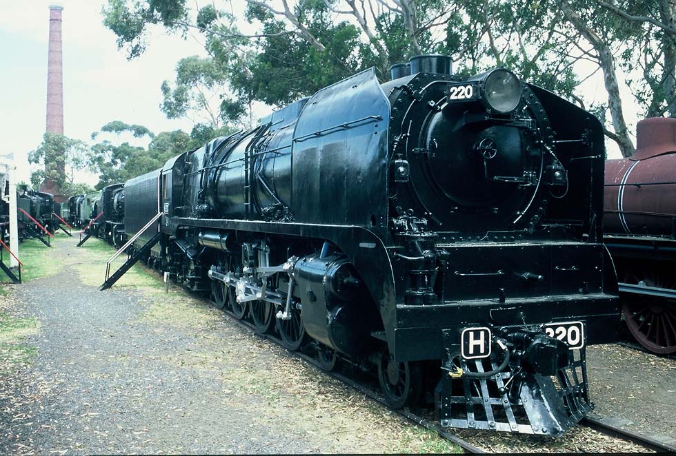 Über die Breitspurgleise nordwaerts nach Albury zum Umsteigen nach Sydney donnerte einst der Stromlinienzug Spirit of Progress oder einfach der "Spirit", und einige Male mit ihm der "Heavy Harry", die groeßte klassische Schnellzuglok außerhalb Nordamerikas. Über 92 Fuß oder 28 Meter lang liegt er heute auf den Schienen des Museums North Williamstown, eine schwarze Masse, Tender, Fuehrerstand, Umlauf, Windleitbleche und Belpaire-Feuerbuechse fast eine einzige Flaeche, auf dem ueberdimensionalen Kessel zwei separate Schornsteine, eine der schoensten Riesenlok der Welt, ein perfektes Ungeheuer.
