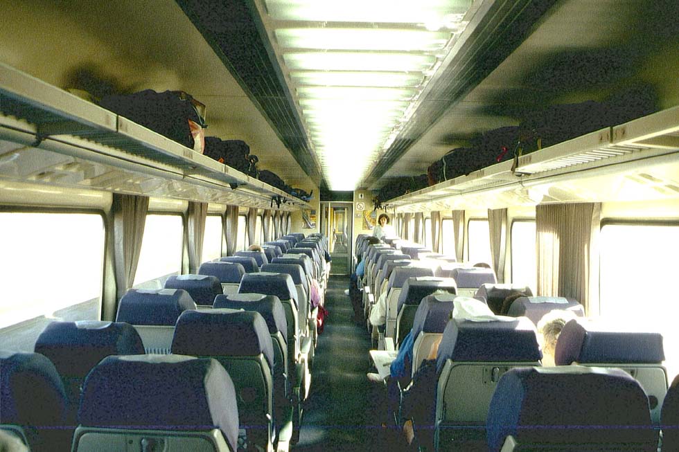 Der Olympic Spirit aus Sydney kommt entgegen. In der Nacht wird er als Southern Cross nach Sydney zurueckfahren und damit das unproduktive Stillager der reinen Tages- oder Nachtzuege vermeiden. In der Tat ist der letzte Wagen unseres XPT ein Sleeping Car mit Zweibettcoupees, zum Gang hin verglast, zwischen je zweien eine WC- und Duschkabine, ueber eine Nische im Flur zugaenglich.