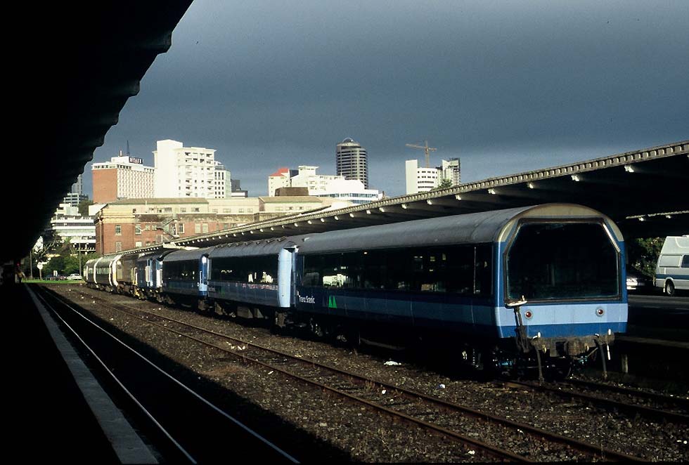 So klein, so ruhig ist Auckland im Vergleich zu Sydney, besonders am Sonntag. Nichts los im Hafen, alles leer um den Bahnhof herum. Wird er ueberhaupt offen sein? Ein Schild verkuendet naemlich in jenem Jahr 1997: "Railwaystation for sale", zum Verkaufen. Weit hinter dem Gruenderzeitbau steht aber ein Zug und Leute warten davor: Eine sechsachsige General Motors Nr. 7036, ein Gepaeckwagen, drei kurze Kapspur-Vierachser, der letzte zum Aussichts-Schlusswagen umgebaut, huebsch gepolsterte Flugzeugsessel darinnen, alles blau lackiert mit "Tranz Scenic"-Aufschrift - der Nachtzug Northerner nach der 685 km entfernten, eher noch ruhigeren Hauptstadt Wellington. Auf dem Nachbargleis stehen noch aelter aussehende Wagen, fuer Sonderfahrten, wie ein Rangierer erklaert. "Der Nachtzug ist auch nicht neuer, so aus den vierziger Jahren", sagt er noch.