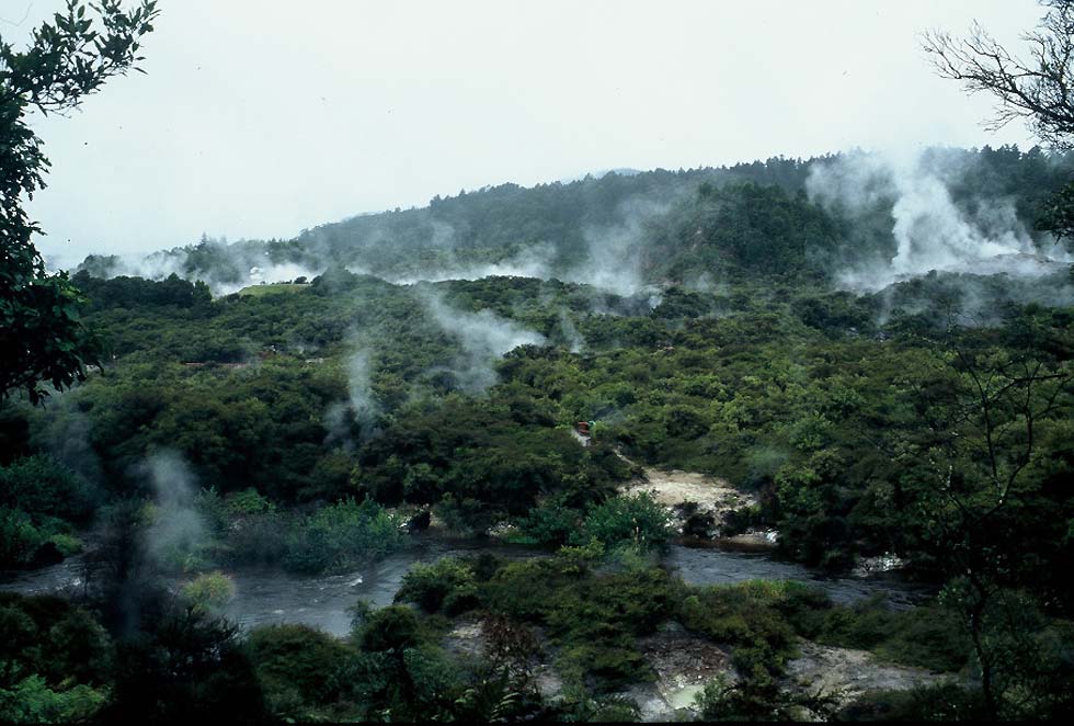 Reisende steigen zu, dann geht die Fahrt ueber Weideland nach Westen. Hinter Matamata ruecken die Grashuegel naeher zusammen. Bei Putaruru, alles Namen aus der Maori-Sprache, beginnt die Steigung hinauf auf das vulkanische Plateau. Zwischen Kiefern, Schilf und Farnkraut windet sich das Gleis. Begleitet von Laubbaeumen und Riesenfarnen, die wie Palmen aussehen, erreicht es die Hochflaeche, von der aus der Blick nach dem nahen See geht. Der Zug kommt in dem Kurbad Rotorua an, einem Haltepunkt wie auf freier Strecke. Umsteigen bei einem warmen Regen in den Kleinbus zur Fahrt in das Wunderland kochender Quellen, brodelnder Schlammloecher und dampfender Geyser...