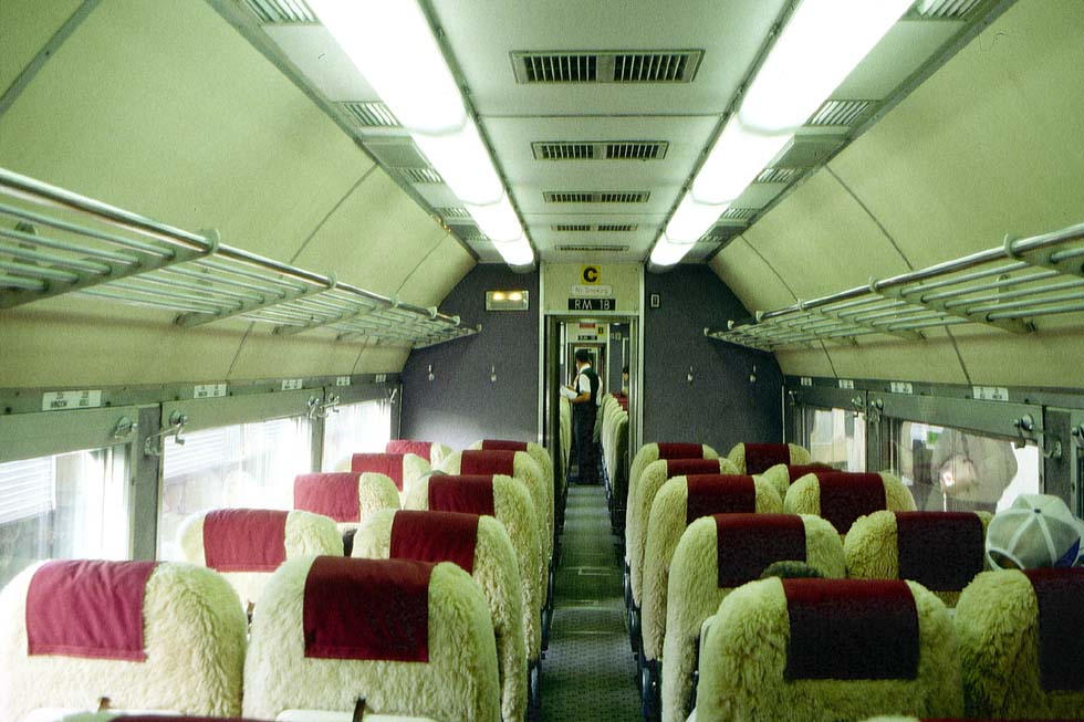 Vor dem "Silver Fern" prueft der Service-Chef die Platzreservierungen, Einsteigen, weiche fellbezogene Sessel, immer in Fahrtrichtung gedreht, nehmen die Passagiere auf, in einem Interieur aus Chrom, Neon und dicken Teppichen. Der Zug ist 1973 als Klasse RM von Toshiba gebaut worden.