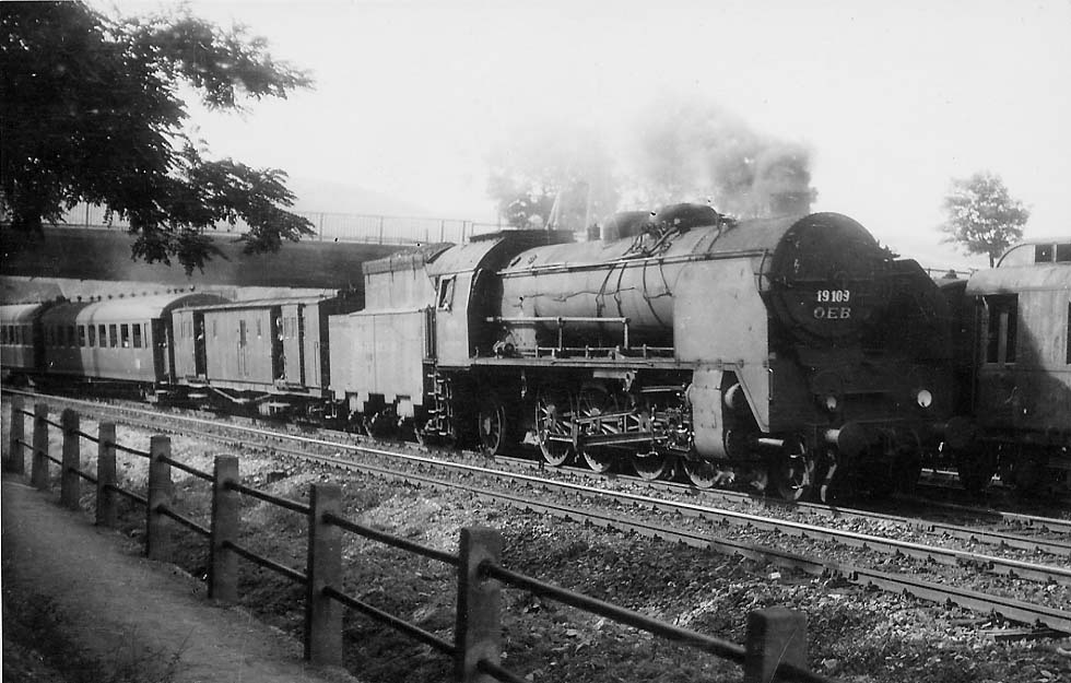 From 1945 for a short time there were the expresses DUS607/608 Paris - Munich Oberwiesenfeld/ Nurnberg and DUS 705/706 Nice - Karlsruhe - Munich Oberwiesenfeld/ Nurnberg Roethenbach for American forces. On August 22, 1945 started a regular U.S. Army express from Vienna Franz-Josefs-Bahnhof in the American sector to Linz via Langenlebarn, where the U.S. forces had their airfield. A photograph shows an ex-Hungarian 424 class 4-8-0 type engine with American flags, but also classes 19, 33, 50, 52 and on the main line electric engines hauled the train. Initially an American war-type locomotive pushing two wagons secured the line. From December 1945 the train ran to Munich, including CIWL sleepers with the U.S. label, from 1952 only to Salzburg and in October 1955 came the end for this train, which had become known as the "Mozart".