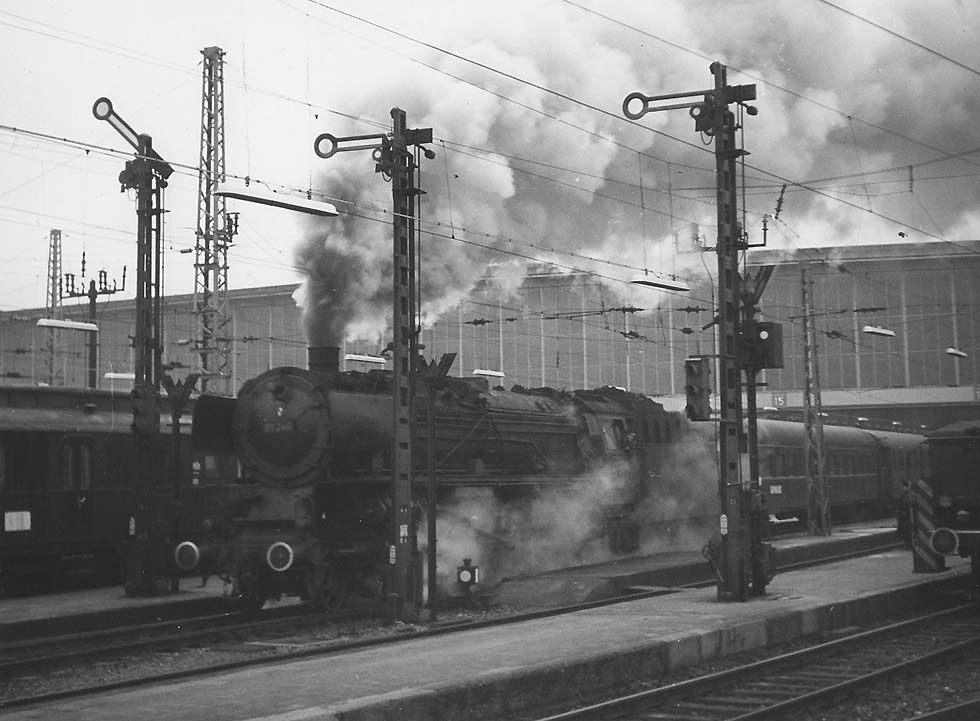 Quer durch Europa von Westen nach Osten Ruettert und rattert die Bahnmelodie Gilt es die Seligkeit schneller zu kosten? Kommt er zu spaet an im Himmelslogis? Fortfortfort fortfortfort drehn sich die Raeder Rasend dahin auf dem Schienengeaeder; Rauch ist der Bestie verschwindender Schweif, Schaffnerpfiff, Lokomotivengepfeif...