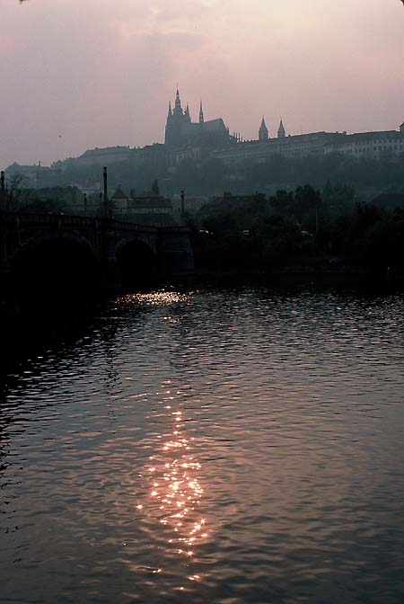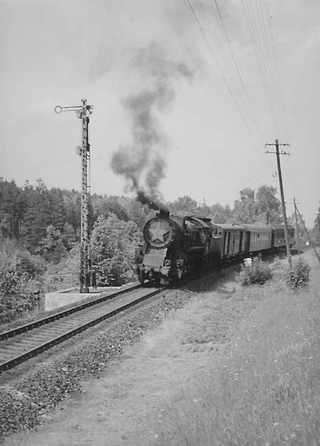 In Schirnding kann man weiter an den letzten Haeusern des kleinen Ortes vorueber und an dem einen Gleis entlang zu Fuß nur gehen soweit man sich im Wald und im Gestruepp getraut... denn die nahe Grenze ist der "Eiserne Vorhang", damals, im Fruehsommer 1963. Nach einiger Zeit der Stille kommt der Zug aus dem Bahnhof heraus, eine tschechische Gueterzuglok 556.0 mit Sowjetstern, drei Wagen aus Stuttgart, am Schluß ein CSD-Wagen und der alte Wagon-Lits ST Paris - Prag aus dem Orient-Express. Langsam entschwindet er in einer Rauchwolke, Kohlengeruch hinter sich lassend - auf dem Weg in die eigene Heimat, damals verschlossen.