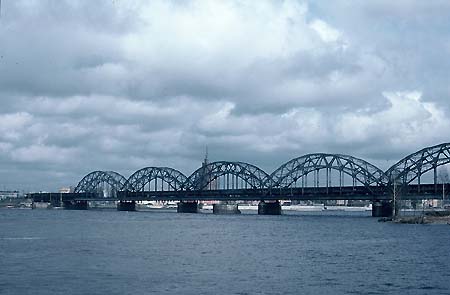 Bei Siauliai kreuzt unser Bus die Bahn, die zweigleisige Hauptstrecke nach Riga, bei Meitene stehen sich litauische und lettische Zollposten gegenueber, in Jelgava fuehrt die Linie vorueber an dem Barockschloss von Rastrelli, dem Baumeister des St.Petersburger Winterpalastes, und vor Einfahrt in Riga ueberquert sie die Daugava oder Duena - den fast einen Kilometer breiten Fluss, sturmgepeitscht an jenem Apriltag, auf einer vielbogigen Stahlbruecke, die Stadtsilhouette am jenseitigen Ufer: Schloss, romanischer Dom, die Spitze der Petri-Kirche, der phantastische Fernsehturm, die kuehne Vansu-Haengebruecke zur Linken, eine wahrhafte Metropole, Hansestadt, das "Paris des Ostens" einst, Hauptstadt heute - großartig.