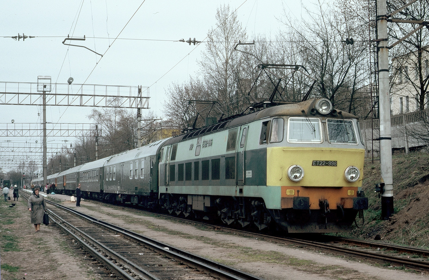 "Koenigsberg-Express", the former GDR government train, exceptionally running Grodno - Berlin, Polish ET22-996 on standard gauge track in Grodno, Belarus, April 25, 1992 (WS)