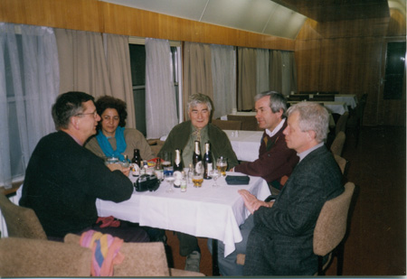 Die Speisewagen unseres Regierungszuges sind geoeffnet, eine schweizerische Reisegruppe war in die Nummer 7 zum Abendessen gebeten worden, wir gehen durch den teppichbelegten Seitengang eines Kuechenwagens in das Restaurant 3, den Wagen 056. Ein holzgetaefelter Salon ueber fast die ganze Laenge, breite weiß gedeckte Tische nur an einer Seite, die andere als großzuegige freie Flaeche, lassen die drangvolle Enge normaler Speisewagen vergessen. Die "roten Preußen" wussten schon zu reisen... Vor dem Zubettgehen noch ein Blick aus dem geoeffneten Fenster: der Zug steht in Rzepin, dem einstigen Reppen, Kohlenrauch kommt von draußen, der Geruch des Ostens. Im Staatszug der DDR in die Russische Foederation zu fahren - der Gedanke zum Einschlafen erscheint surreal.