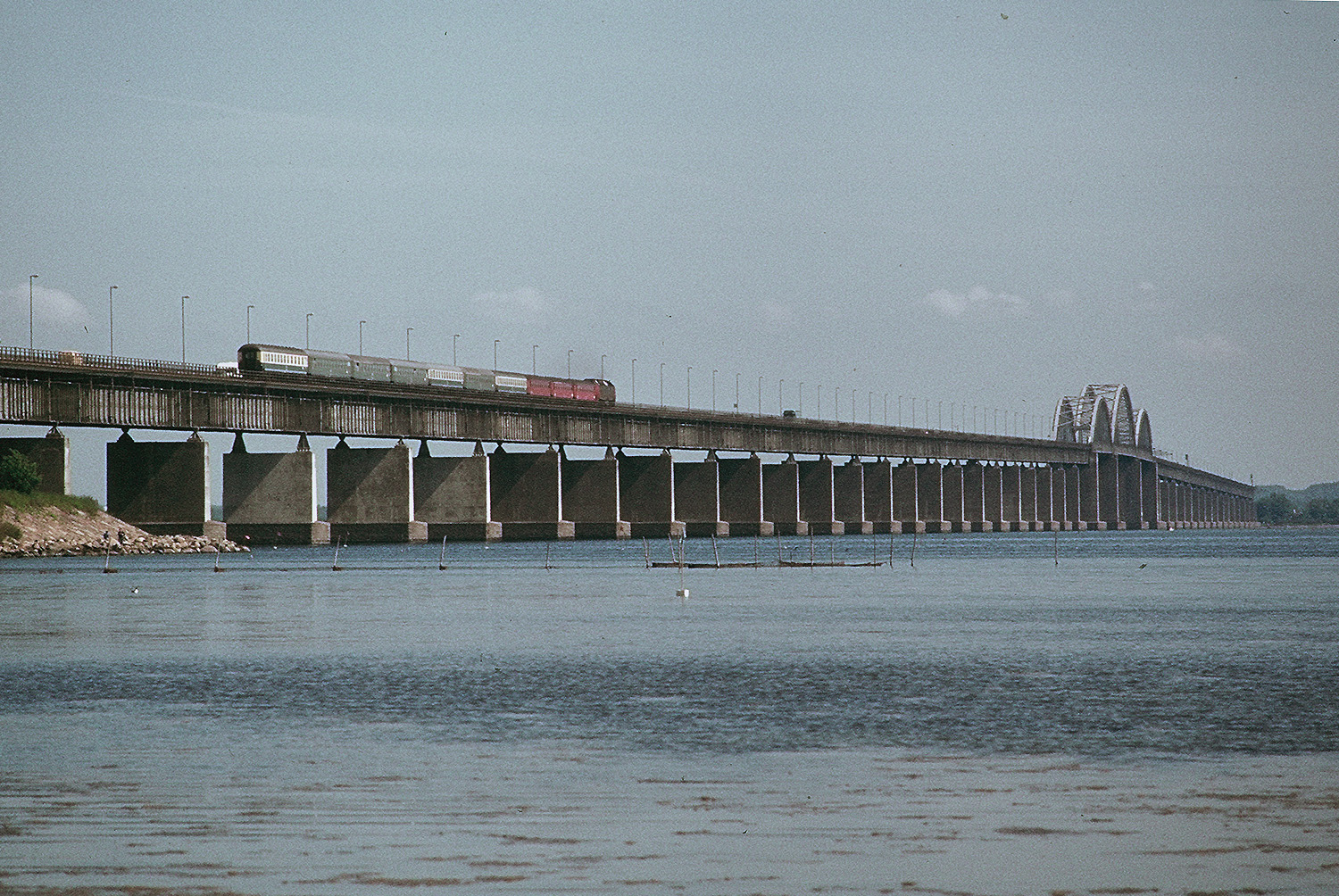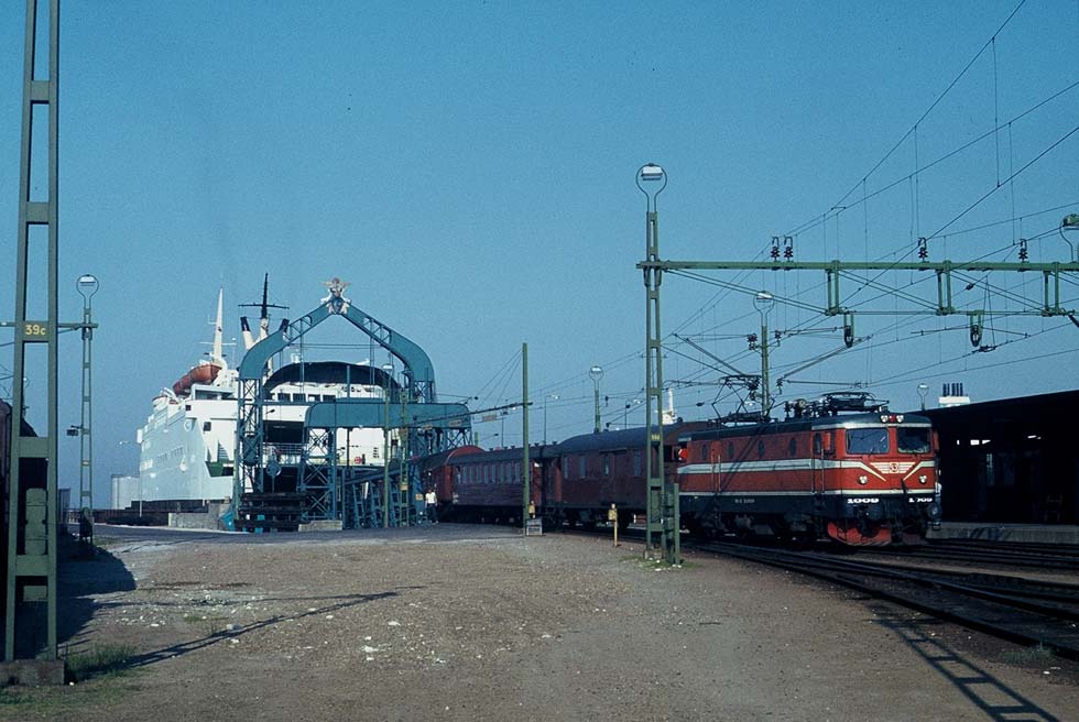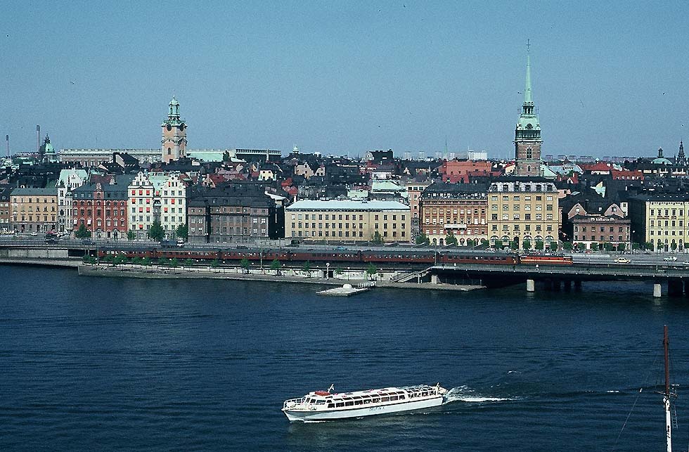 Wasserflaechen im Sonnenlicht, dahinter die Stadt, rotbraun, blassgruene Kupferdaecher, das ist Stockholm an einem schoenen Fruehsommertag. Am Vaertan kommen die Schiffe der Silja Line aus Turku an, mit Zugsanschluss aus Helsinki. Frueher hatte es noch eine kuerzere Faehrstrecke aus Finnland gegeben, die in Norrtaelje an die schmalspurige Roslaegens-Bahn nach Stockholm Östra anschloss, heute eine elektrifizierte Vorortlinie. Aus dem Central-Bahnhof heraus, am spiegelnden Riddarholmen entlang, kommt am Nachmittag kurz nach zwei einer der typischen braunen Schnellzuege der SJ mit orangefarbener Rc-Ellok nach Goeteborg vorueber, ein ebensolcher nach Malmoe, am Schluss mit einem roten Mitropa-Schlafwagen nach Berlin - der Sassnitz-Express - ,dann noch ein Zug nach Malmoe, einmal in der Woche mit einem gruenen sowjetischen Schlafwagen nach Moskau, der unterwegs auf den Sassnitz-Express ueberstellt wird, danach der Zug nach Hamburg, an seinem Ende ein DB-Liegewagen und ein roter DB-Schlafwagen. Es ist der 1.Juni 1982 und das sind damals die einzigen internationalen Langstreckenzuege hier. Kein Skandinavien-Italien-Express schippert mehr mit den Faehren zum Kontinent, kein Italia-Express kommt mehr ueber Schwedens oder Daenemarks Bruecken gebruellt...