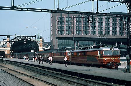 In Oslo hat sich schon gegen Mittag von dem schoenen alten Teil des Bahnhofs ein Zug in Bewegung gesetzt mit zwei NSB- und einem DSB-Wagen nach Kopenhagen, drei der SJ nach Helsingborg und einem der NSB nach Holden, gezogen von der Standard-Ellok der Serie 13, alles braun, außer dem dunkelroten DSB-Wagen. Einmal in der Woche fuehrt dieser Zug einen sowjetischen Schlafwagen Oslo - Moskau. Diese "politischen" Kurse wurden mittels Verzicht auf Achskilometerausgleich subventioniert durch den Kreml - waehrend die Schlafwagen von Oslo fuer den Nord-Express oder den Italia-Express laengst verschwunden sind. Um zehn Uhr nachts wuerde der sowjetische Wagen zusammen mit dem Sassnitz-Express in Trelleborg auf das Trajektschiff ueberstellt werden.