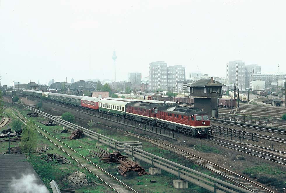 Der Berlinaren und der Saßnitz-Express werden in jenen Jahren von dunkelroten Ellok der DR-Baureihe 243 gezogen, der eine ueber Pasewalk, der andere ueber Neustrelitz. Frueher rangierten in Saßnitz die Tenderlok-Baureihen 74 und 94. Und die Pacific der Reihen 03, 01 und zuweilen 015 donnerten durch Vorpommern... Die Sowjet-Schlafwagen aus Stockholm und aus Oslo werden am Berliner Ostbahnhof auf den Ost-West-Express ueberstellt. Dazu kommt ein sowjetischer Schlafwagen aus Kopenhagen ueber die Faehrstrecke Gedser - Warnemuende im Ostsee-Express, dem der Wagen des Saßnitz-Express nach Muenchen beigestellt wird. Der Ostsee-Express benuetzt damals die alte Route des Nord-Sued (Brenner)- und des Berlin-Neapel (-Palermo,-Taormina)-Express aus der Epoche vor dem 1. Weltkrieg.