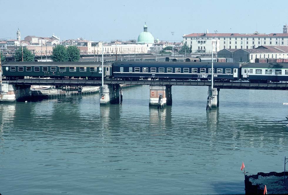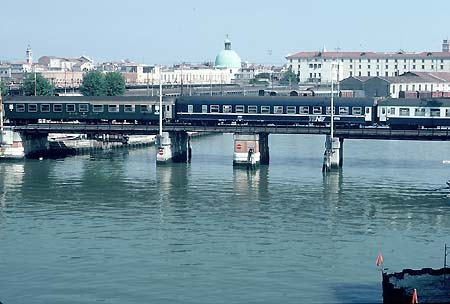 Eine andere Fahrt nach Venedig ist auch in Erinnerung geblieben, in so einem schrecklichen Liegewagen des Brenner-Express. Am Morgen erzaehlte eine Deutsche auf der Bank gegenueber, eine Bruenhilde wie aus einer Wagner-Oper, wie sie sieben Jahre lang in Warschau verheiratet den Kommunismus ertragen hatte, und ihre blonde Haarpracht fiel auf das purpurne Nachtgewand, in deren Rueschen sie fast ertrank. Als der Zug nach Überqueren der Lagune in den Bahnhof Venezia Santa Lucia einlief, fragte sie, ob sie so, im purpurnen Nachtgewand, aussteigen koenne und - tat's... Der Elettrotreno "Arlecchino", ein verkleinerter "Settebello", am Nachmittag auf der Bruecke ueber der Lagune war fast nicht auffaelliger...