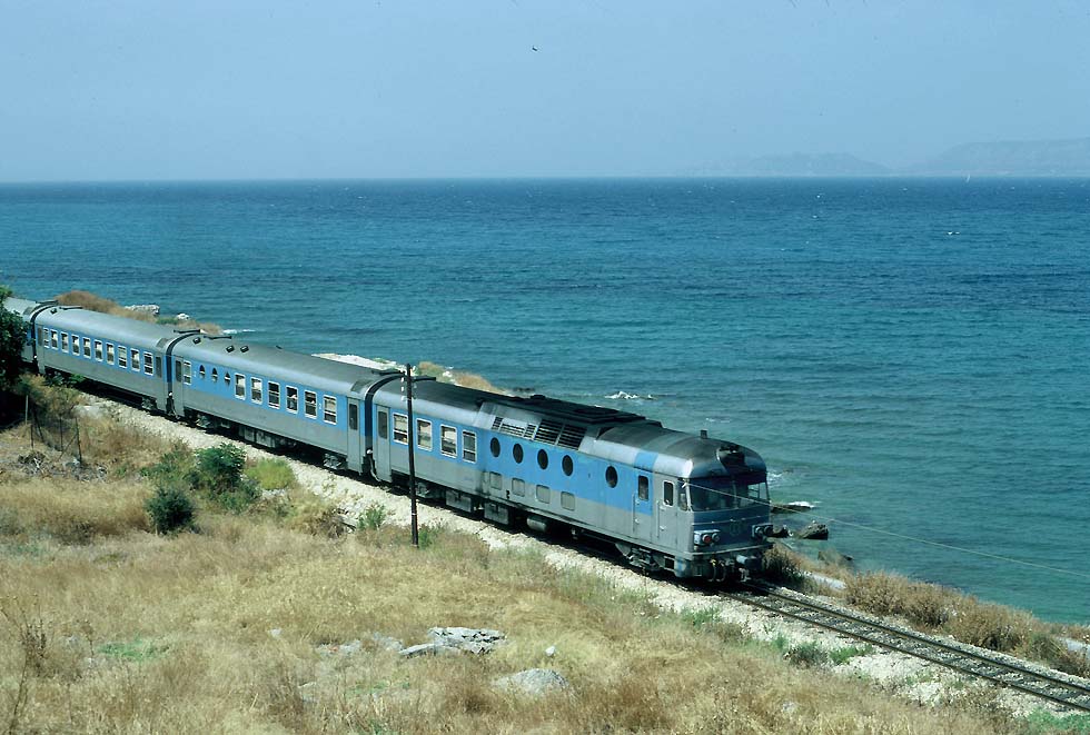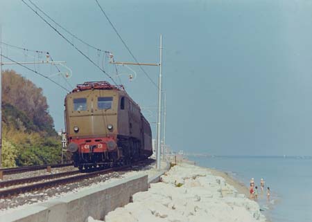Tage darauf faehrt der Triebwagen nach Foggia ueber Aversa und Caserta auf jener eingleisigen Gebirgsstrecke, auf der die Australian Mail von der Kanalkueste herkam, um in Neapel den Orient Liner zu erreichen. Sie war in Foggia von der Indian Mail abgekuppelt worden. Auf deren Strecke nach Brindisi geht es nun mit einem Personenzug hinter einer E428 weiter. Endlose Weinfelder, kahle Staedte mit Flachdaechern, die ersten Trulli sind zu sehen, und dann - die Adria. Eine Station heißt Monopoli (Paul Morand hatte von endlosen Poker-Partien im Peninsular-Express der Indian Mail geschrieben, aber nichts von Monopoli-Partien). In Bari ist die Oberleitung zu Ende, der Zug Lecce - Turin mit zwei DB-Wagen nach Muenchen kommt mit einer gruen/ockerfarbenen Diesellok 445 entgegen. Dann Brindisi: Der unscheinbare Zug "Parthenon" aus Paris mit einer 341-Diesellok steht hier.