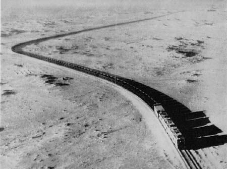 Beyond the Sahara a meter-gauge connection Bamako - Dakar existed, the Dakar-Niger, with a branch to Saint-Louis on the mouth of the Senegal river. Still now that line links Senegal with Niger. In the Western Sahara, in guerrilla-ruled Mauretania, French general Calmel already in 1922 proposed a "Transmauretanien" to connect Mogador port in Morocco with the Senegal, avoiding Spanish-Sahara. It remained a dream. Quite another railway, a standard gauge line for phosphate transport, was built by the French Miferma company in 1963 between Tazadid, an isolated place in the desert, and the port of Nouadhibou (Port-Etienne). Up to five Alsthom or three green General Motors diesels hauled 20000 ton-freight trains. Sometimes people (and their animals) secretly travelled on it and in 1973 SNTFM coupled a coach Zouerate-Nouadhibou to the rear of the trains, two kilometers long. Around 1990 SNIM announced couchette service and then ATTM offered even sleeping accommodation together with motorcar transport on the way through the desert. A sensation was announced in 2000: A tourist special, consisting of a twin-deck and another coach, light-blue and cream colored, hauled by a turquoise/cream Alsthom - le Train du Désert.