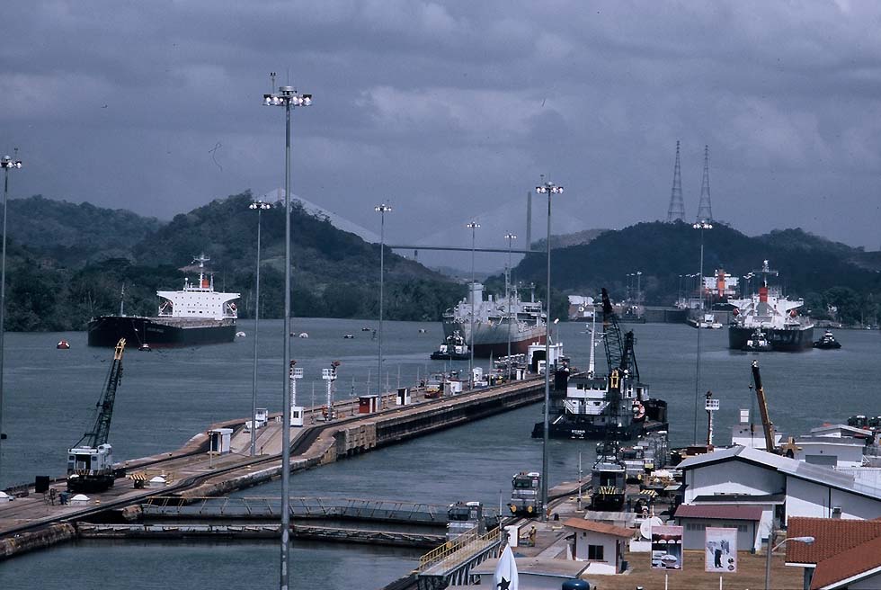 Panama Canal, Miraflores locks, in the background the new bridge of the Carreterra Interamericana (WS)