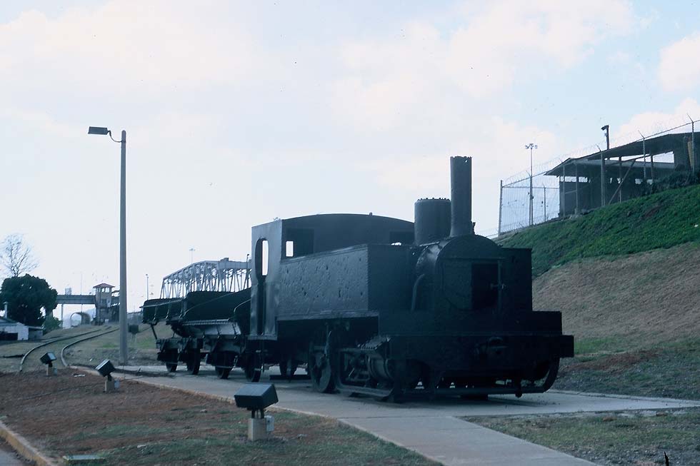 Broad-gauge three-coupler from Franco-Belge 1885, used for building the Panama Canal, on exhibition at Miraflores locks (WS)