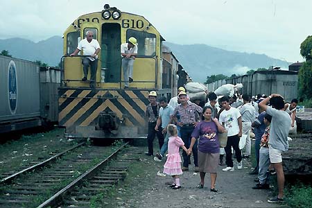 Honduras, passenger train with diesel 610 after arrival at Tela, Jan.1992 (Thomas Wunschel)