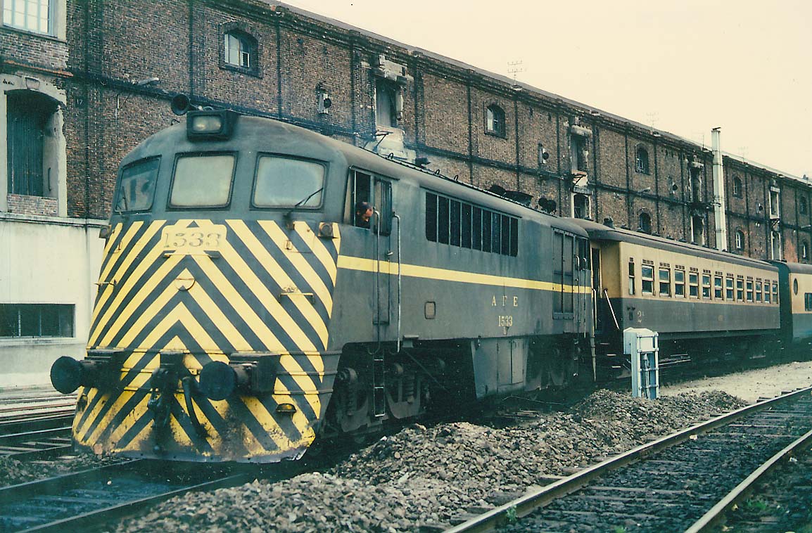 Passenger train with diesel 1533 at Montevideo, Uruguay, August 1987 (Guenter Haslbeck)