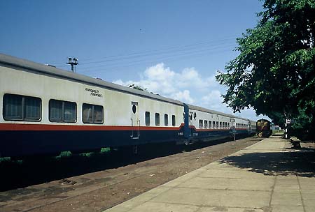 American diesel engines and modern cars built under Fiat license in Argentina, first painted dark-green, then dark-blue/red/cream, replaced steam and the old wooden cars. Still in the '80s El Gran Capitan with coaches from Asuncion offered sleeper, diner, Pullman and motorcar transport Posadas - Buenos Aires.