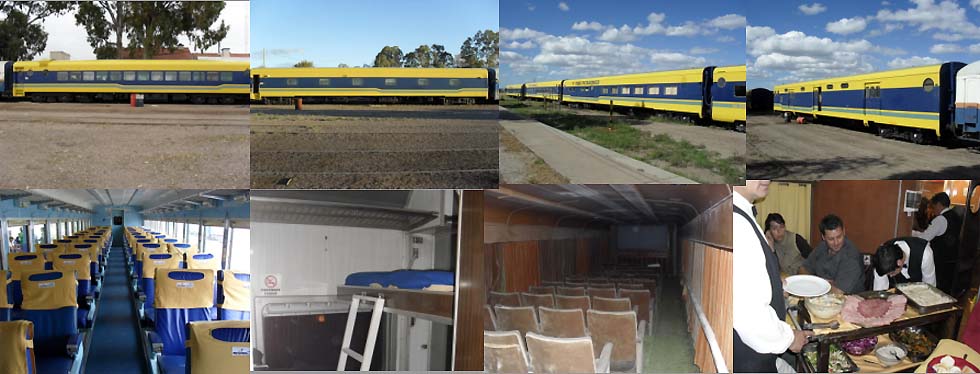 The "Tren Patagonico" uses six different types of coaches. The pictures show a pullman coach, a sleeper coach, the restaurant coach and the baggage coach and in the bottom row the interieur of a pullman coach, a sleeper coach, the cinema coach and the restaurant coach. (Héctor Cassano)