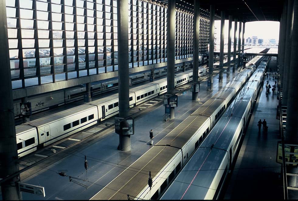 Der Atocha-Bahnhof, von dem aus Reisende des Sud-Express nach Marokko weitergefahren sind, ist mit seiner altertuemlichen Halle in ein wundervolles Monument mit Palmen und Kaffeehaus verwandelt worden, ein Treffpunkt vor der Abreise nach Sevilla. Der neue Teil des Bahnhofs, in Stahl und Glas geplant von dem Architekten Alberto de Palacio, grenzt gleich an. Sicherheitskontrolle wie am Flughafen (vorbildlich nach dem Massenmord-Anschlag im Jahr zuvor), dann Platznehmen in der "Abflug"-Lounge, unten hinter den Glaswaenden laufen weiße AVE-Hochgeschwindigkeitszuege des TGV-Typs ein und aus, daneben steht ein AVE102 mit dem skurrilen Entenschnabel. Er soll um 14 Uhr nach Sevilla starten, sagt die nette Stewardess, und er sei "noch schneller". Unser AVE ist ein TGV-Typ, eine halbe Stunde vor der Abfahrt darf man auf den Bahnsteig hinunterfahren, Einsteigen in ein Interieur mit blauen Sitzen und einer gewissen franzoesischen Eleganz. Gegenueber steht ein Triebzug Serie 104 fuer den schnellen Regionalverkehr, weiter hinten ein weiß-blauer Talgo 200 mit Ellok 252 aus Malaga und ein weißer "Altaria"-Talgo zur Fahrt nach Barcelona, noch mit Spurwechsel (wir schreiben das Datum April 2005). "Gewoehnliche" Zuege haben in dieser Normalspurhalle des Atocha-Bahnhofs nichts zu suchen (sie fahren nebenan ein Stockwerk tiefer auf Breitspur ein und aus).