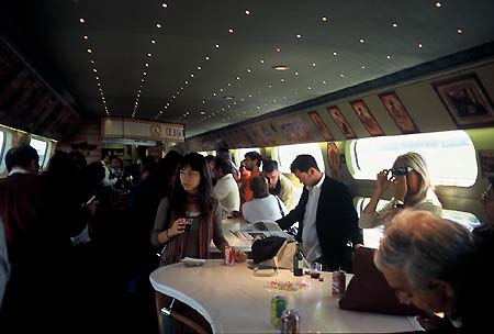 In einem Dorf tauchen die ersten Palmen auf. Und es gibt den ersten Halt seit Madrid: Cordoba. Alte LX-Schlafwagen, umgebaut und herausgeputzt, alle braun mit cremefarben, stehen auf einem Breitspurgleis. Es ist Al Andalus Expreso, der Nostalgie-Luxuszug, die Vergangenheit. Die Gegenwart, das ist "unser" AVE - 1 Stunde 38 Minuten fuer 345 km, Schnitt 211 km/h. Die Cafeteria im Wagen Nr.4 ist voll von jungen Leuten, hier spielt sich das Leben ab. Tage zuvor schon waren einige der stuendlich verkehrenden Zuege ausgebucht, wohl wegen der "Feria" von Sevilla.