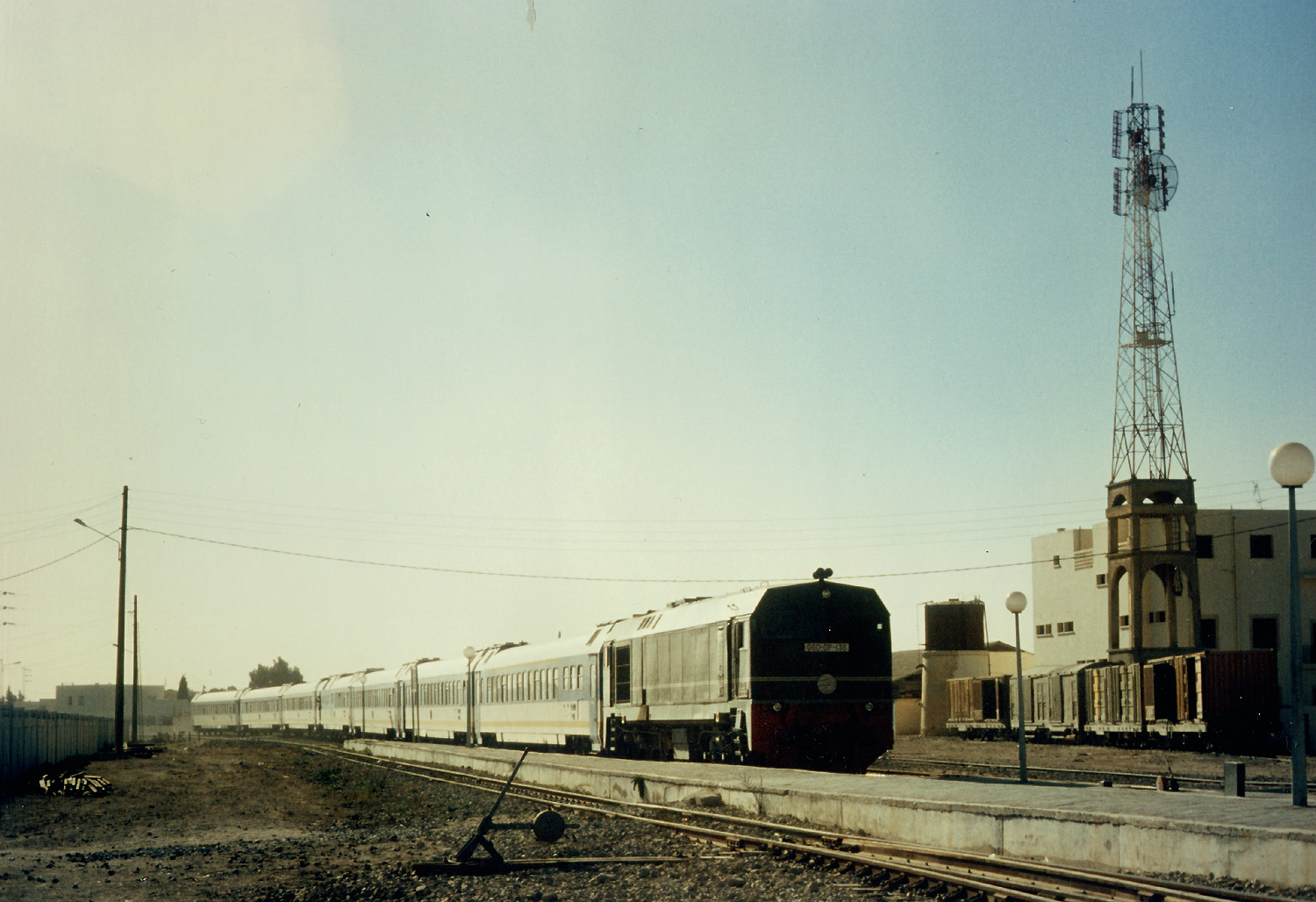 Sousse, am Bahnhof der SNCFT, der Société Nationale des Chemins de fer Tunisiens, am 17. November 1996 bei 25 Grad (in Deutschland herrscht Winter): Ein Glockenspiel ueber Lautsprecher und Ansage auf Arabisch und Franzoesisch kuendigt die Einfahrt des "direct" 5125 auf Meterspur von Tunis nach Gabès an. Hinter einer gruenen sechsachsigen Reisezugdiesellok 060-DP des kanadischen, auch an den Irak gelieferten, Typs von Bombardier mit Stirnfuehrerstaenden, laeuft der Zug puenktlich um 9 Uhr 15 ein, sieben Wagen in Blau-Weiß mit gelber Linie, eine Garnitur von Ganz-Mávag. Einsteigen in die II. Klasse, Kunstledersitze hintereinander, Neonlicht, Klimaanlage, und ab und zu eine Frau weiß verschleiert, seltener ein Herr mit rotem Fez, der Chechia, unter den europaeisch gekleideten Juengeren. Der Schaffner, korrekt uniformiert wie in Frankreich, kontrolliert die Fahrkarten - und mit viel Hupen geht es mitten durch die Stadt, wie eine Straßenbahn, die Autos bleiben stehen, unterhalb der 1100 Jahre alten Stadtmauer zum Hafen und an der Station Bab Jedid vorbei. Von dort aus fahren die 25 kV-Elektrotriebzuege YZ-E von Ganz der "banlieue" nach den Ferienparadiesen Monastir und Mahdia. Zweimal am Tag laeuft auch ein "direct" von Tunis aus hinter einer ungarischen Diesellok 040-DO dorthin durch. Unser Schnellzug benuetzt das gleiche Gleis bis Sousse Sud und biegt dann ins Landesinnere ab.