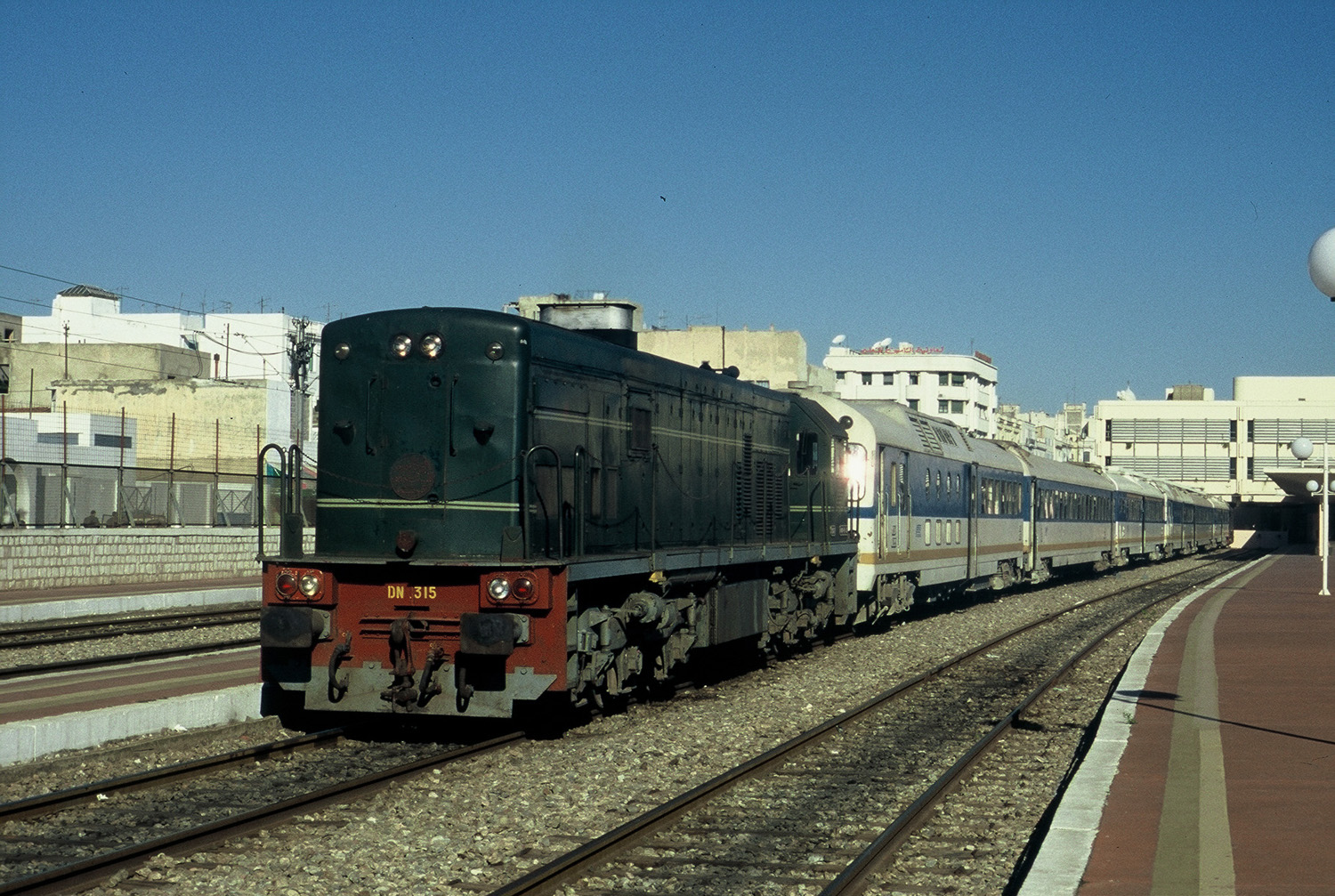 Tunis Barcelone: ein moderner Bahnhof aus Beton und Glas, nebenan die gruene Metro. Und die Straßen dahinter, die franzoesischen Aufschriften, die Fassaden, die Kathedrale, das ist wie Marseille, das ist beinahe Frankreich. Wie weit weg liegt doch Gabès in seinem Sandstaub! Auf den Normalspurgleisen, wo einst der "Train de luxe Tunis-Constantine-Alger-Oran" mit seinen weißen Dreiachsern aus dem ersten Orient-Express-Wagenpark zur Abfahrt bereitgestanden haben mag, wo vor Jahren die tunesischen silbernen Inox-Wagen des Transmaghreb nach Algier starteten, steht jetzt am 18. November 1996 noch dessen MLW-Typ 060 DI und daneben, hinter der ebenso schmutziggruenen sechsachsigen 060-BN-315 von General Electric, ein aus zwei dreiteiligen Ganz-Mávag-Triebwagen improvisierter Zug. Seine drei Klassen, auch "confort", sind besetzt, sein blau-weißer Anstrich wirkt schon etwas ausgebleicht - das ist vom Express Tunesien-Marokko TM 1 "Transmaghreb" uebriggeblieben: ein Zug, den die Abfahrtstafel namenlos lediglich nach der Grenzstation Ghardimaou angibt. Als die gleiche Garnitur abends zurueckkommt, scheint ihre einstuendige Verspaetung darauf hinzudeuten, dass vielleicht doch irgendein Anschluss aus dem fuer Touristen nun unzugaenglichen Algier abgewartet worden ist.