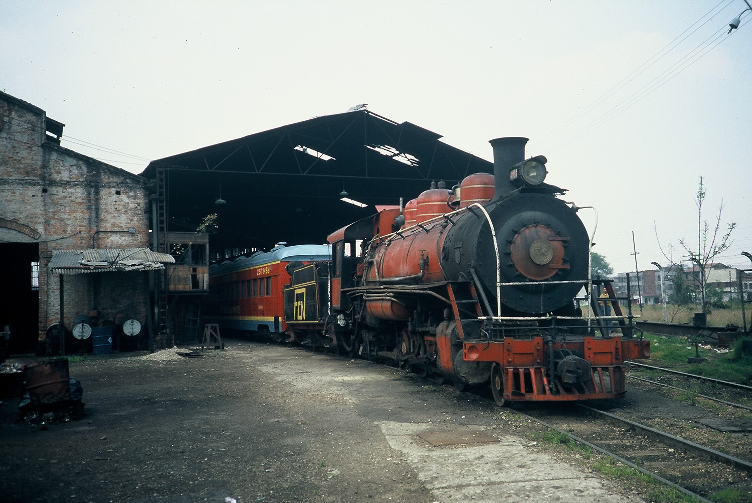 Sonntags, heißt es, sollen manchmal Touristenzuege fahren. Durch die im Reisefuehrer als "unsicher" beschriebene Gegend des Bahnhofs Sabana geht es im Taxi, um nicht nochmals solch gut gekleideten Herren zu begegnen, welche sich tags zuvor auf der Straße das Bargeld uebergeben ließen. Die Station, ein Kopfbahnhof, ist an jenem 22. Februar 1996 wie erwartet geschlossen, aber ein freundlicher Eisenbahner draengt geradezu einen Besuch beim Chef des Betriebswerks auf und - da steht schon der einstige Express mit seinen Leichtbauwagen aus den Bahnwerkstaetten in Cali. Im Schuppen fuehrt der "Jefe" zu den Lokomotiven, alles Dampflok, kleinraedrige Mikados von Baldwin aus den vierziger Jahren, die Nummern 72,75 und 85 in Schwarz-rot mit den Initialen der FCN, dahinter "Restaurante" 3008 und der bekannte Aussichtswagen. Alle Wagen sind rot mit gelber Zierlinie gestrichen - als "Turistren" des Ferrocarril Turismo de Sabana fuer gelegentliche Tagesausfluege. Abseits steht ein Sitzwagen im alten dunkelgruenen Anstrich und ein Speisewagen in Hellbraun, wie zur Erinnerung an jene Zeit, als in Kolumbien noch richtige Expresszuege verkehrten, nach Fahrplan und mit Diesellok...