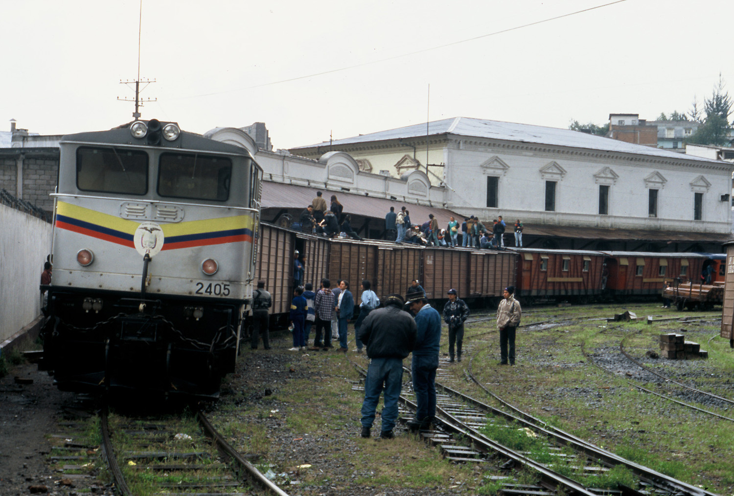 Ecuador, die Hauptstadt Quito, am 17. Februar 1996: Wolken quellen aus den Taelern der fast 3000 Meter hoch gelegenen Gebirgsmetropole, als das Taxi in der Morgendaemmerung auf nassen Straßen durch endlose Vororte zum Bahnhof hinunter faehrt. Der liegt scheinbar verlassen da, aber durch ein Gittertor kann man ueber das Gleis zu einem unglaublich primitiven Zug gehen: Ein zu einer Art blechernem Aussichtswagen mit Nr. 112 umgebauter kurzer Schmalspurvierachser mit offenen Plattformen, davor zwei Einheimischenwagen mit winzigen gesplitterten Fenstern, dann vier Gueterwagen, alles rote Vierachser der staatlichen ENFE, auf einem krummen 3 Fuß 6 Zoll-Gleis, ein Zug von beklemmender Tristesse im Regen. Und es kommen mehr Leute, schließlich sind auch die fensterlosen Gueterwagen voll besetzt, die ersten Passagiere erklimmen die Daecher. Immer mehr nehmen oben im Regen Platz...