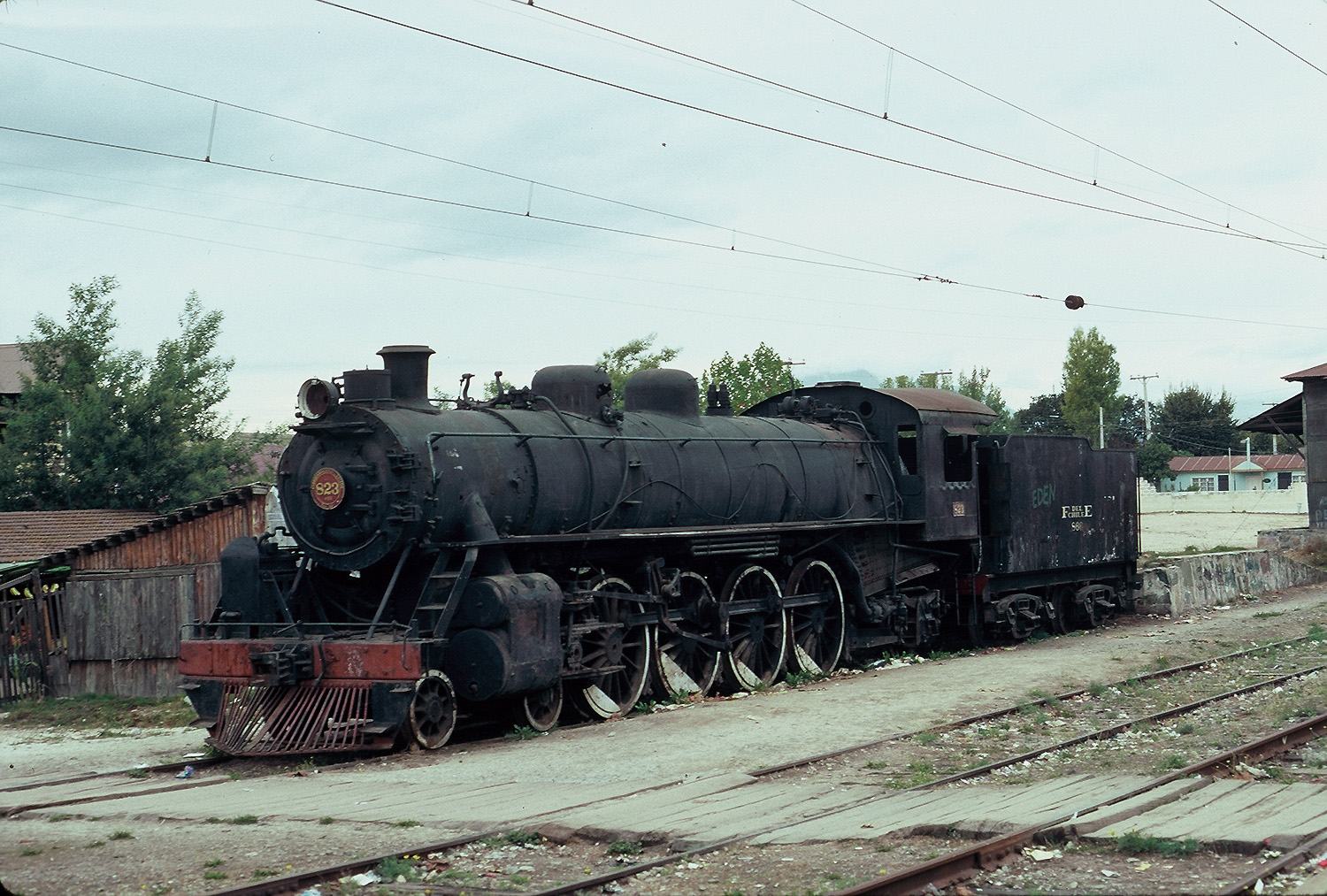 Andere herrliche Lokomotiven stehen im Parque Quinto Normal - und er ist zu. Freundliche Polizisten sperren ihn eigens auf und so beginnt ein Gang wie im Traum. Unter gruenen Baeumen zeigen sich die Schoenheiten: die aelteste eine 2C von Rogers 1896, eine Meterspur-1D von Rogers, C, 1D und 2C von Borsig der Typen 47, 51 und 59, eine 1C Typ 57 von NBL, die 1912 (gegen den Willen der Großmaechte) in Valparaiso gebaute 2C Nr. 306 des Typs 20, mit dem gruenen hoelzernen Praesidentenwagen aus USA, die 1D1 Nr. 903 von Krupp 1935, die wuchtige Trans-Anden-Lokomotive 3349 der FCTC-Meterspur in blassem Gruen und dann die Riesen: die 1929 von Baldwin entwickelte und 1953 noch von Mitsubishi nachgelieferte Mountain Nr. 856 des Typs 80, die 2D2 "Super Montana" des Prestigetyps 100 von Henschel 1935 und, schwarz wie die anderen, aber mit blauen statt roten Raedern die schwerste, die Mountain 1110 des Typs 110 von Alco 1940.