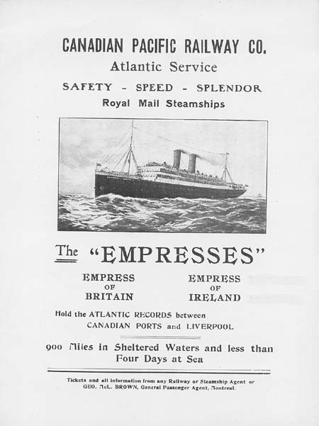 Winner was in the end the Canadian Pacific. In 1886 CP's transcontinental railway was completed and in 1891 their first 'Empresses' started from Vancouver to Hong Kong. 'From Ocean unto Ocean' was their advert slogan. Already in 1886 George Stephen, President of CP, presented the idea of a Liverpool line to the Prime Minister of Canada. In 1903 CP started services from Liverpool and London to Montreal with the "Lake Manitoba" (1901/8,850 gt), taken over from the Beaver Line. When the Allan Line placed the first ocean-going turbine-driven vessels, the "Victorian" and "Virginian" (10,700 gt) on the North Atlantic in 1905, CP countered with the "Empress of Britain" and "Empress of Ireland" (14,200 gt). Built at Fairfield's yard, they were the last British fast liners driven by reciprocating engines, operating on the Quebec - Liverpool route. An attempt by European competitors to create a joint-venture for Canada services, rivaling CP, did not materialize.