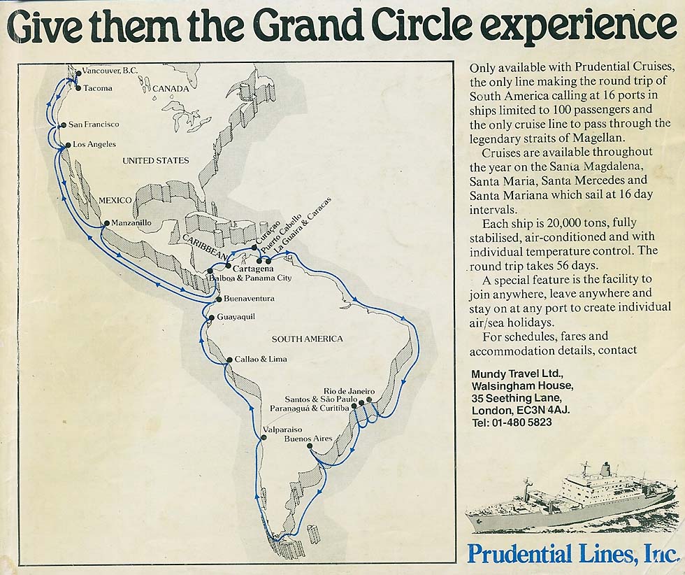 Towards the end of the '70s, long after the Moore McCormack liners had disappeared, Prudential Lines advertised regular trips from Vancouver with passenger-cargo vessels of c. 20,000 tons, advertising: "Only available with Prudential Cruises, the only line making the round trip of South America calling at 16 ports in ships limited to 100 passengers and the only cruise line to pass through the legendary straits of Magellan". Then services on a New York - Panama - Valparaiso route were maintained for some time by Delta Steamship Lines.