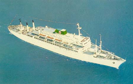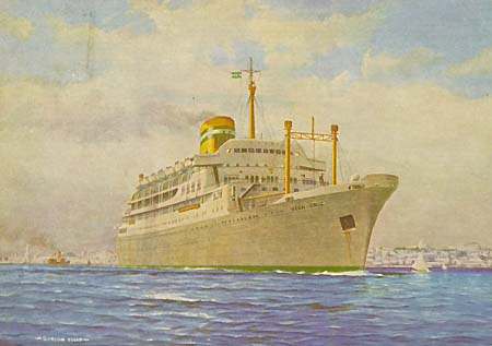 Still in the '70s a UN resolution had reason to criticize the discrimination of non-privileged countries by the 'liner conferences'. Joint-ventures with European groups before WWI had been confined to coastal services (see chapter Branch Lines). An exception was the employment of requisitioned German ships by Lloyd Brasileiro on a Rio de Janeiro - Portugal route in 1917, after WWI extended to Hamburg. The "Sierra Salvada" of NDL, requisitioned in 1917 as "Avare", was given away in the early 20s. When in 1941 the motor ship "Orinoco" (1928/9,880 gt) of Hapag was requisitioned at Vera Cruz by the Mexican government, there was no requirement for this ship, renamed "Puebla". After a troubled career she was acquired by the Cia. Transoceanica Argentina S.L.R. , renamed "Juan de Garay". Her fate was described by Laurence Dunn: During her last years she had a white hull and funnels painted in the national colors light-blue with a white ribbon. As the only vessel of her owners she served, together with Spanish ships of the Ybarra Line, ports on the River Plate, in Spain and Italy. In April 1961 she departed from Montevideo for her last Atlantic crossing. The ship was laid up at Barcelona and in 1962 it was scrapped. The Argentine State Line provided services Buenos Aires - New York. Still in 1960 the Cia. Argentina de Navegacion Dodero advertised proudly the steamers "Presidente Peron", sister "Eva Peron" and the more modest "17 Octubre" providing a 'rapid de-luxe' service Buenos Aires - Lisbon - London. In the '60s only the Argentine Lines or Empresa Lineas Maritimas Argentinas (E.L.M.A.) was listed (by C. Frick) with the "Libertad" (1950/12,653 gt, 18 knots, the ex-"Eva Peron") on the Buenos Aires - London route, the 11,500-ton motor ships "Alberto Dodero" and "Yapeyu" of 1951 on the Naples route and the 11,300-ton motor ships "Rio Jachal" and "Rio Tunuyan" of 1950-51 on the Hamburg route. Chile had in pre-war times the Compania Sud Americana de Vapores. At the end of the '70s the ABC Shipping Guide mentioned only second-ranking cargo-passenger services by various companies.