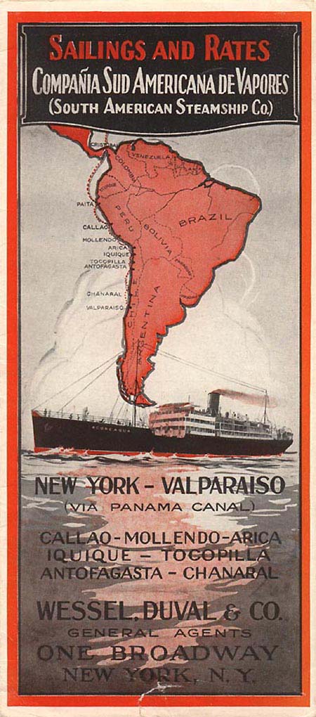 At the outbreak of WWI the timetable registered the United Fruit Company and the Pan American Route. After opening of the Panama Canal the Grace Line introduced passenger services from New York via Panama to South American West Coast ports in 1916. For that impoverished region the Grace Line steamers, marked by a green funnel, have been a vital contribution. Later the amalgamated Prudential Grace Lines maintained services New York - Chile.