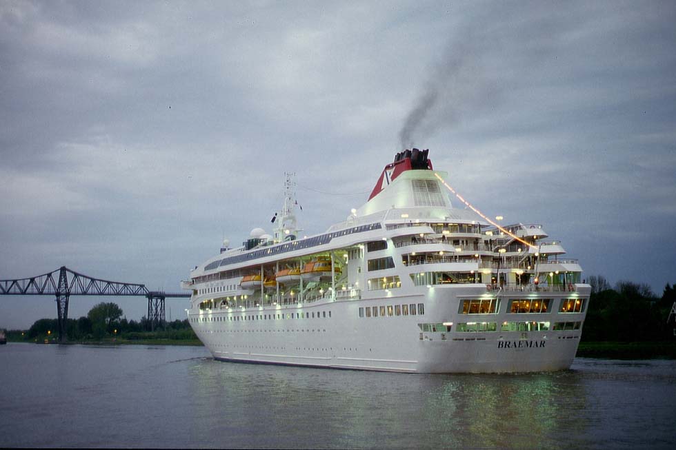 Rendsburg, a small town in the northern most federal country of Germany, Schleswig-Holstein, halfway on the Nord-Ostsee-Kanal, on a rainy evening in 2007: The high steel girder bridge, towering as a landmark over the flat country-side, carries the railway from Germany to Denmark. Now and then the suspension ferry crosses the canal which forms the important waterway between the North and the Baltic Sea. A cruise ship from Southampton heading for Sweden has been announced, but is taking a long time to come. Darkness is falling in by the time. Once again ship traffic has changed direction. A number of costal cargo ships are approaching from the west. There, look at...! In the distance the lights of a white ship are coming into sight. It appears being the "Braemar" of the Fred. Olsen Cruise Line, the former "Crown Dynasty" of 1993. With her 19,000 tons not very large, but facing the tiny brick houses along the bank she is looking enormous. A few people on deck are waving, the dining saloon lets see its glittering lights. Most passengers seem to have their dinner. As the ship is passing by under the bridge, it sends out a threefold wail. Thereafter its lights are vanishing in the dark, heading for Kiel...