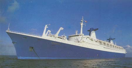 The Kloster family had bigger dreams. They dreamt of acquiring the laid-up Blue Riband winner “United States”, but U.S. laws prevented it and so she stood idle. Kloster purchased instead in 1979 the famous top-liner “France” of 1962, laid-up at Le Havre, from Akkram Ojeh of Saudi Arabia at a price of only 18 million dollars. At Bremerhaven she was rebuilt for Klosters R/A, her capacity being raised to 2,400 passengers, with increasing her gross tonnage from 66,343 to 70,702. To save fuel, four of the eight steam turbines and two of the four screws were removed, reducing the speed from 31 to 17-25 knots, sufficient for cruises. Renamed “Norway”, she was given a new blue and white painting. In 1980 diesel engines were added and in 1984 she was fully converted to diesel power. The “Norway” cruised in the Caribbean for Norwegian Caribbean Lines, then Kloster Cruise Ltd, and was praised as the “number one among world’s cruise ships”. In 1990 once again the capacity was risen, now to 2,560 pax. Additional decks did change her tonnage to 76,049. The “Norway” continued cruising for the Norwegian Cruise Line (NCL), the label adapted in 1987, until in 2003 a boiler explosion caused casualties among the crew. A friend told the story of a voyage aboard the “Norway” a few months before: The cabins showed still the ‘Art Deco’ design, but the aged vessel was “rockin’ and rolling” and very noisy. After the accident the ship was tugged to Bremerhaven, in 2005 to Port Klang and in 2006 as “Blue Lady” to Alang in India for scrapping. Lawyer disputes let rise some hope to get the ship saved, nevertheless the ex-“France”, one of the most beautiful ships ever built, was scrapped in 2008. It’s a tragedy.